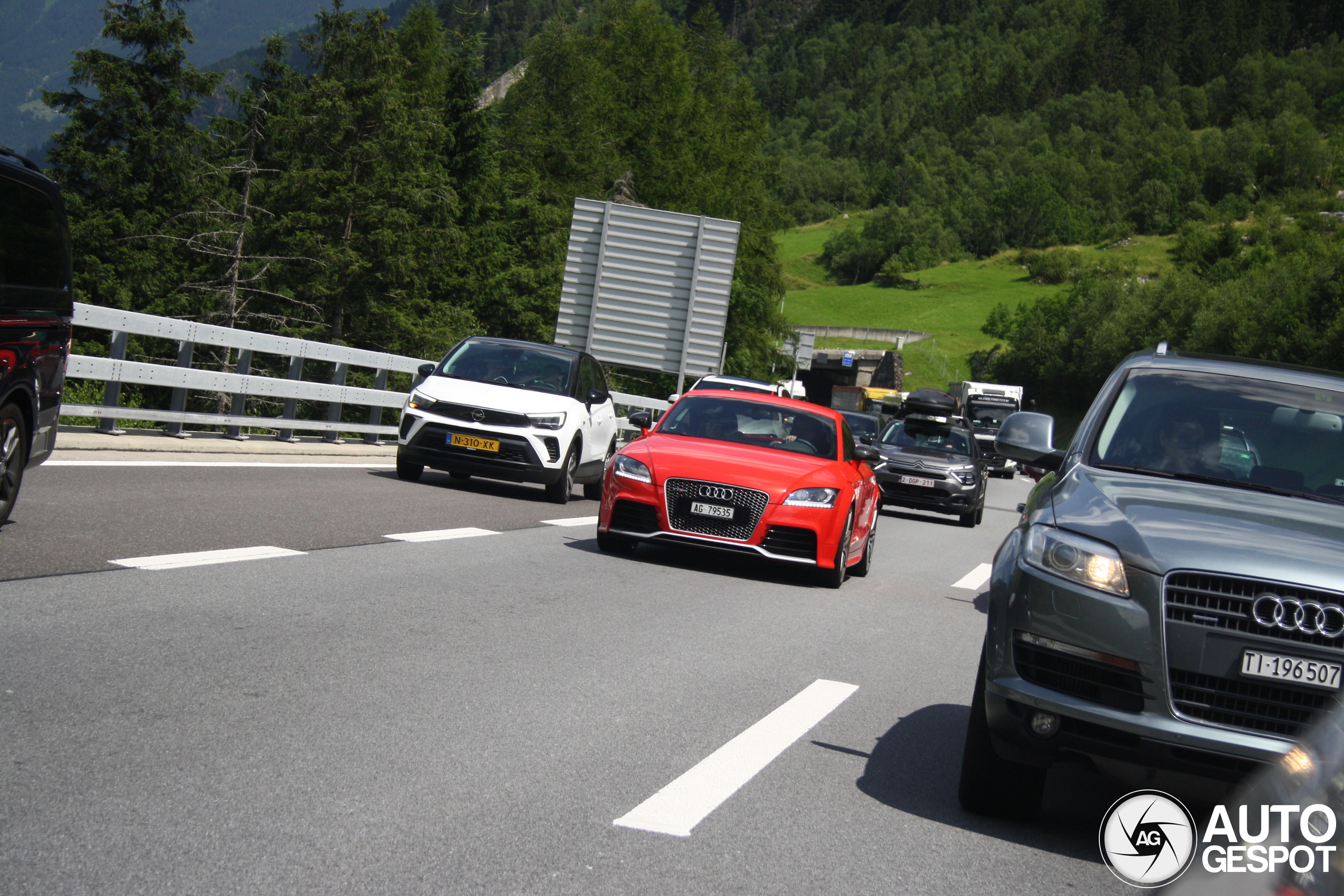 Oud archiefspotje op de snelweg tussen de prachtige Zwitserse bergen.