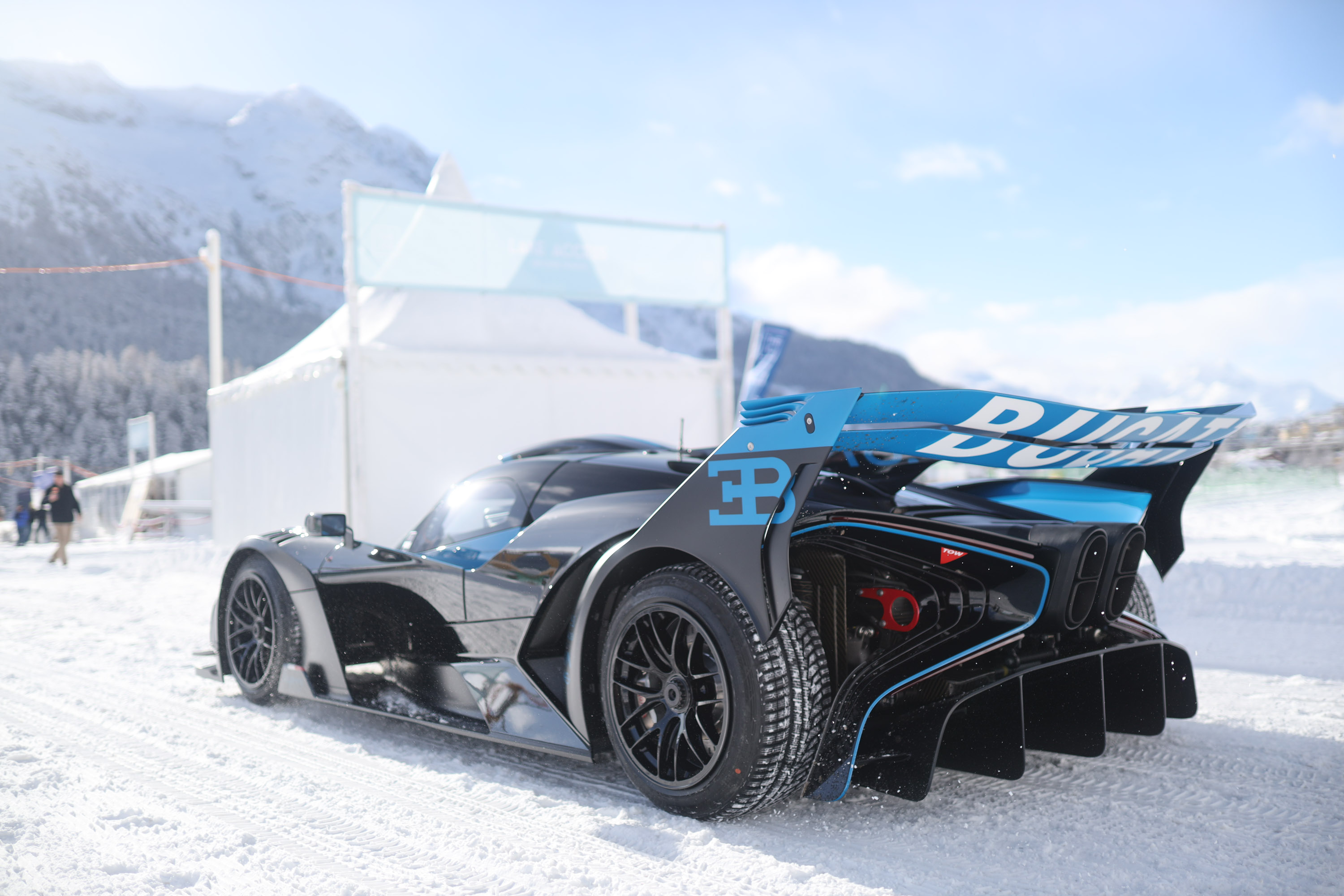 Als wäre das nicht schon genug, stell dir Folgendes vor: nicht einer, sondern gleich drei reine Trackonly-Bugatti Bolide fahren auf Eis. Ja, das ist wirklich passiert. Ein roter, ein blauer und ein schwarzer, alle auf den zugefrorenen See losgelassen. „Völlig surreal“ beschreibt es nicht einmal ansatzweise.